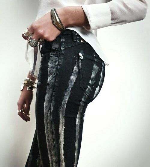 I used this inspiration for another way to customize my jeans. I used white acrylic paint and a medium sized paint brush to make lines all the way down my jeans.
