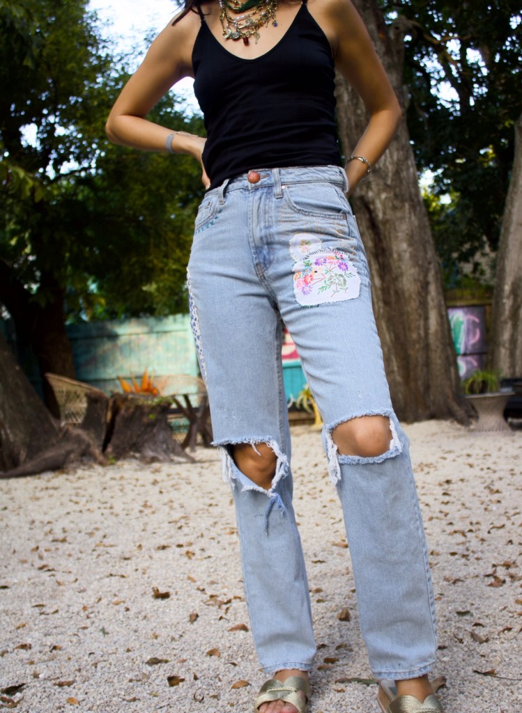 Pinterest gave us inspiration to patch up these pants that I got from the bins, and also to place a button on them! I had been wearing them without a button and using accessory scarves as a belt. My friend, and often my stylist, Dayanara (Dee for short), brought her threads of all colors, patches from discarded fabrics, cloth scissors, and we got to work.
